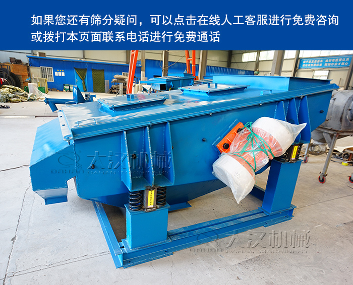 以上就是石英砂礦用振動篩進行篩分工作時要注意的問題,如果您還有篩分疑問,可以點擊在線人工客服進行免費咨詢或撥打本頁面聯系電話進行免費通話。買機石英砂礦用振動篩,就選<大漢機械>!