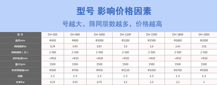葵花籽不銹鋼振動篩型號有DH400型、DH600型、DH800型、DH1000型、DH1200型、DH1500型、DH1800型、DH2000型。不同大小的型號所配備篩網層數也不同(可達到五層),型號越大篩網層數越多價格越高。