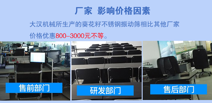大漢機械所生產的葵花籽不銹鋼振動篩在原有的篩分工藝基礎上精益求精,不僅每一道工序自主研發、生產設計和銷售,省去了大量的外購成本和中間商環節,力求成本較低化薄利多銷讓利給廣大用戶,相比其他廠家價格優惠800-3000元不等。