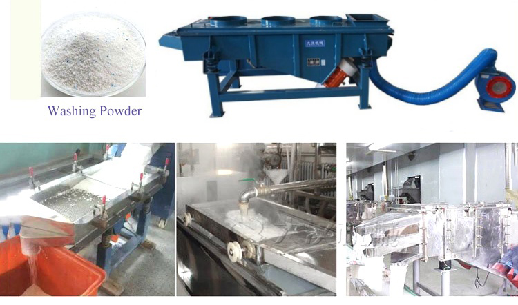 大漢機(jī)械降溫直線振動(dòng)篩這對高溫特性物料設(shè)計(jì)研發(fā),可在有效降低物料溫度后再對物料進(jìn)行篩分,有效的提高了篩分效率及處理量,下面以洗衣粉為例說明風(fēng)冷式振動(dòng)篩的應(yīng)用。洗衣粉在剛剛完成生產(chǎn)后,通常為120度左右的高溫,如不進(jìn)行降溫處理,篩選分級非常困難,而洗衣服不適合傳統(tǒng)的水冷式降溫。在洗衣粉生產(chǎn)線上用“大漢牌”風(fēng)冷式直線振動(dòng)篩,剛生產(chǎn)完成120度高溫洗衣粉通過輸送設(shè)備直接進(jìn)入風(fēng)冷式直線振動(dòng)篩,經(jīng)過安裝在設(shè)備進(jìn)料口底部的風(fēng)機(jī)降溫冷卻系統(tǒng),(不符合要求的結(jié)塊物料通過安裝在進(jìn)料口端的篩網(wǎng)篩選后從出料口旁的小型排料口排出,見下圖,該裝置可根據(jù)物料特性選裝),可直接將洗衣粉溫度降至40-50度后再進(jìn)入直線振動(dòng)篩完成篩選分級工作。